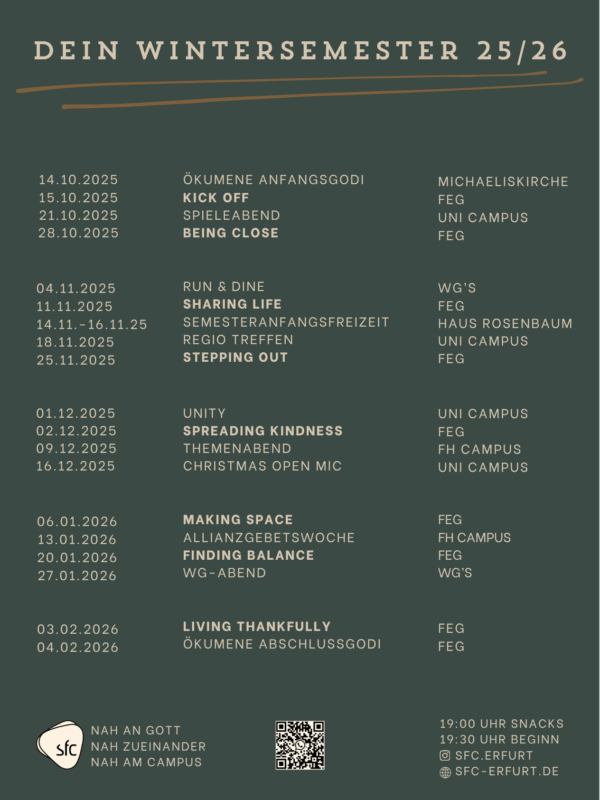 Dafür treffen wir uns immer abwechseln auf dem Uni-Campus und in der FeG Erfurt.